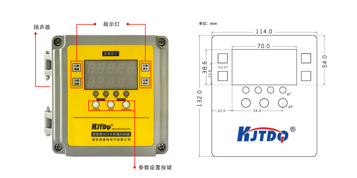 控制器功能主要是開機自檢功能,將激光傳感器接收到的信號進行處理和計算,根據(jù)檢測到的距離,作出相應(yīng)的機電動作(語音報警和PLC控制)。可在0.5-35m的量程任意設(shè)定兩個距離作為減速和停車,安裝在司機室或電氣室梁內(nèi):控制器的功能主要是將激光傳感器接收到的信號進行處理,根據(jù)檢測到的距離,作出相應(yīng)的繼電器報警和減速,停車動作,具有報警及語音提示等功能。