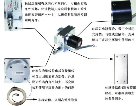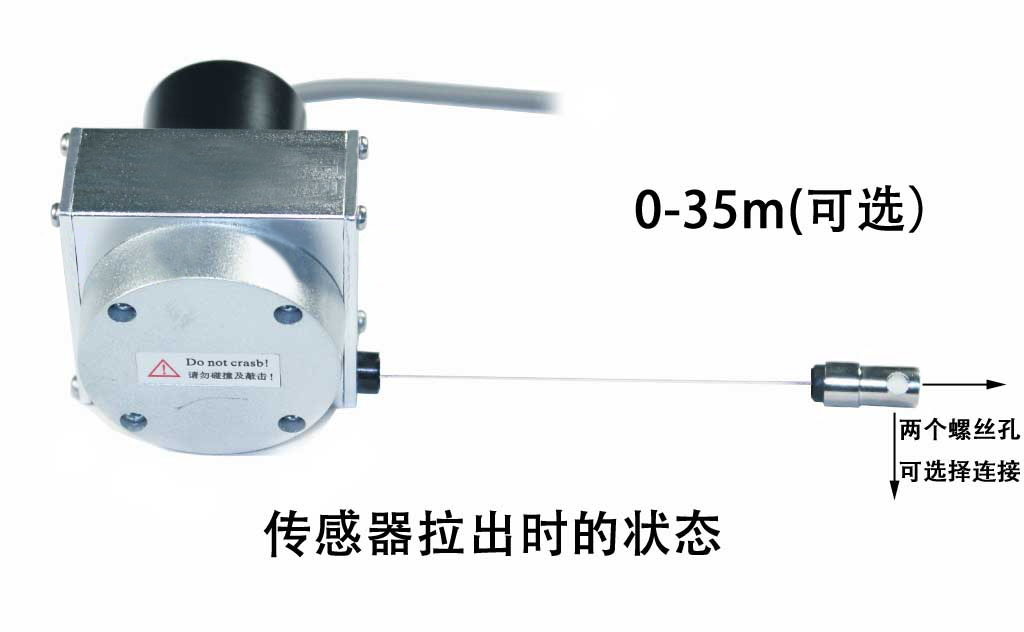 拉線位移傳感器可將機(jī)械位移量轉(zhuǎn)換成可計(jì)量的、成線性比例的電信號(hào)。當(dāng)被測(cè)物體產(chǎn)生位移時(shí),拉動(dòng)與其相連接的傳感器繩索,繩索帶動(dòng)傳感器傳動(dòng)機(jī)構(gòu)與編碼器同步轉(zhuǎn)動(dòng);當(dāng)位移反向移動(dòng)時(shí),傳感器內(nèi)部的自動(dòng)回旋裝置將自動(dòng)收回繩索,并在繩索伸收過(guò)程中保持其張力不變;從而輸出一個(gè)與繩索移動(dòng)量成正比例的電信號(hào)。 傳感器具有獨(dú)立自動(dòng)排線機(jī)構(gòu),保證拉伸繩自動(dòng)均勻排線、保證傳感器具有高獨(dú)立線性精度和較長(zhǎng)的傳感器使用壽命。