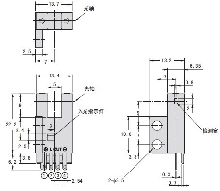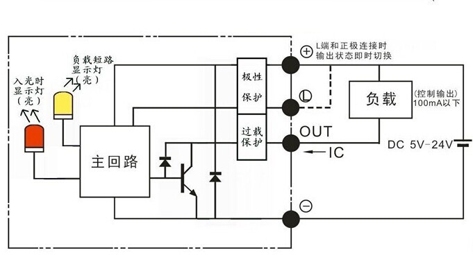 ● “L”引腳與“+”引腳相接時(shí),輸出狀態(tài)即時(shí)轉(zhuǎn)換如:受光時(shí)指示燈不亮、“out”無(wú)輸出電流,相接后指示燈不亮、但“out”有輸出電流。其它各引腳接線錯(cuò)誤時(shí),傳感器不工作,但傳感器本身不會(huì)損壞。